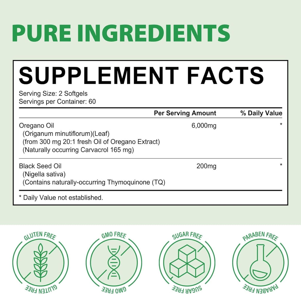 - Suministro de larga duración: con un suministro de 60 días de potente aceite de orégano con aceite de semilla negra, nuestras cápsulas blandas proporcionan un soporte continuo. Manténgase protegido y mantenga su salud con este poderoso remedio herbal probado por el tiempo.