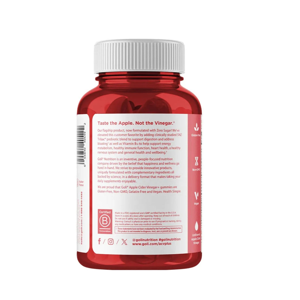 Gomitas de vinagre de manzana sin azúcar, formulada para quienes prefieren evitar azúcares añadidos pero desean disfrutar de la conveniencia de estos suplementos en formato gomoso. Mantiene una mezcla de ingredientes que aportan vinagre de manzana, vitamina B12 y probióticos de tipo Bacillus para apoyar la digestión y el bienestar en general.