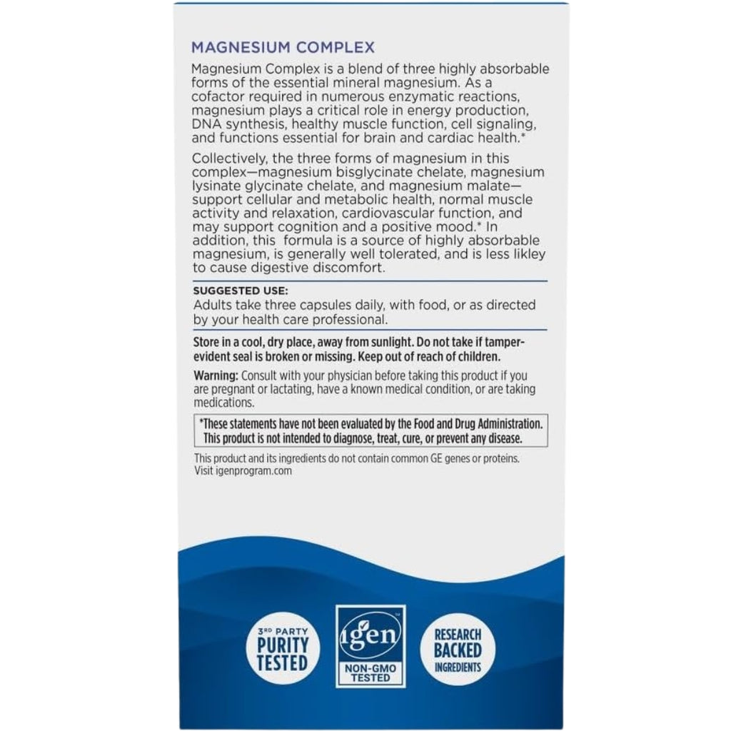 - Tres formas de magnesio: el complejo de magnesio es una mezcla de tres formas altamente absorbentes del magnesio mineral esencial: glicinato de magnesio, aspartato de magnesio y taurinato de magnesio.